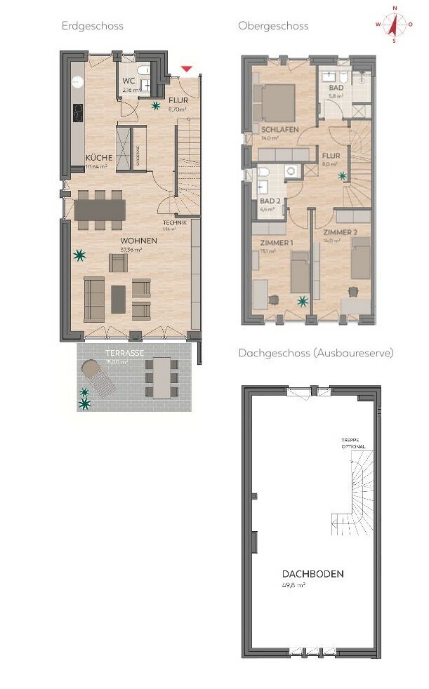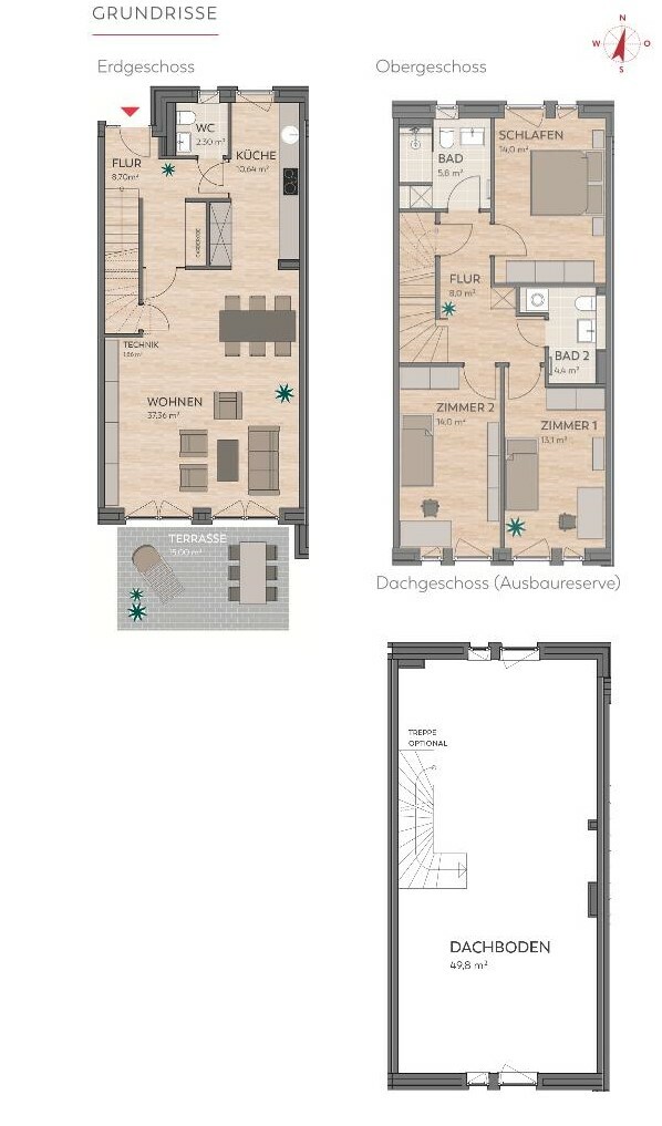 Die Häuser umfassen jeweils 4 Zimmer und gliedern sich in Erdgeschoss, Obergeschoss und Dachgeschoss. Das Dachgeschoss ist nicht ausgebaut und bietet somit eine Ausbaureserve von ca. 49m².
