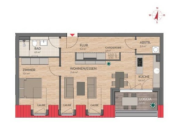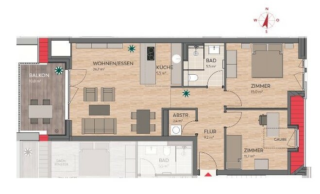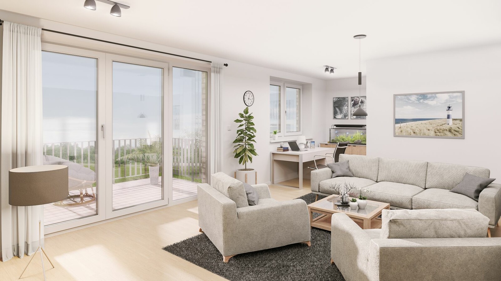 Alle Außen- und Innendarstellungen der Gebäude sind keine realen Bilder, sondern unverbindliche Visualisierungen. Die tatsächliche Gestaltung und Bauausführung können hiervon abweichen.