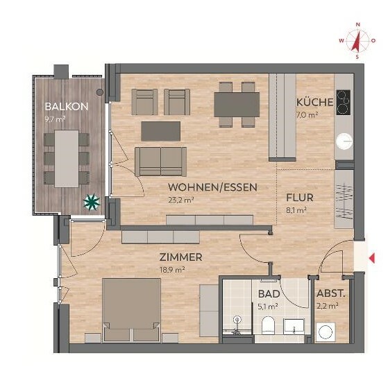 Jede der 2- bis 4-Zimmer-Wohnungen (zwischen 53 m² bis 114 m²) ist mindestens entweder mit einem Balkon, einer Loggia oder einer Terrasse ausgestattet. Diese sind jeweils über einen Zugang barrierearm (Schwellenhöhe 2 cm) zu erreichen.