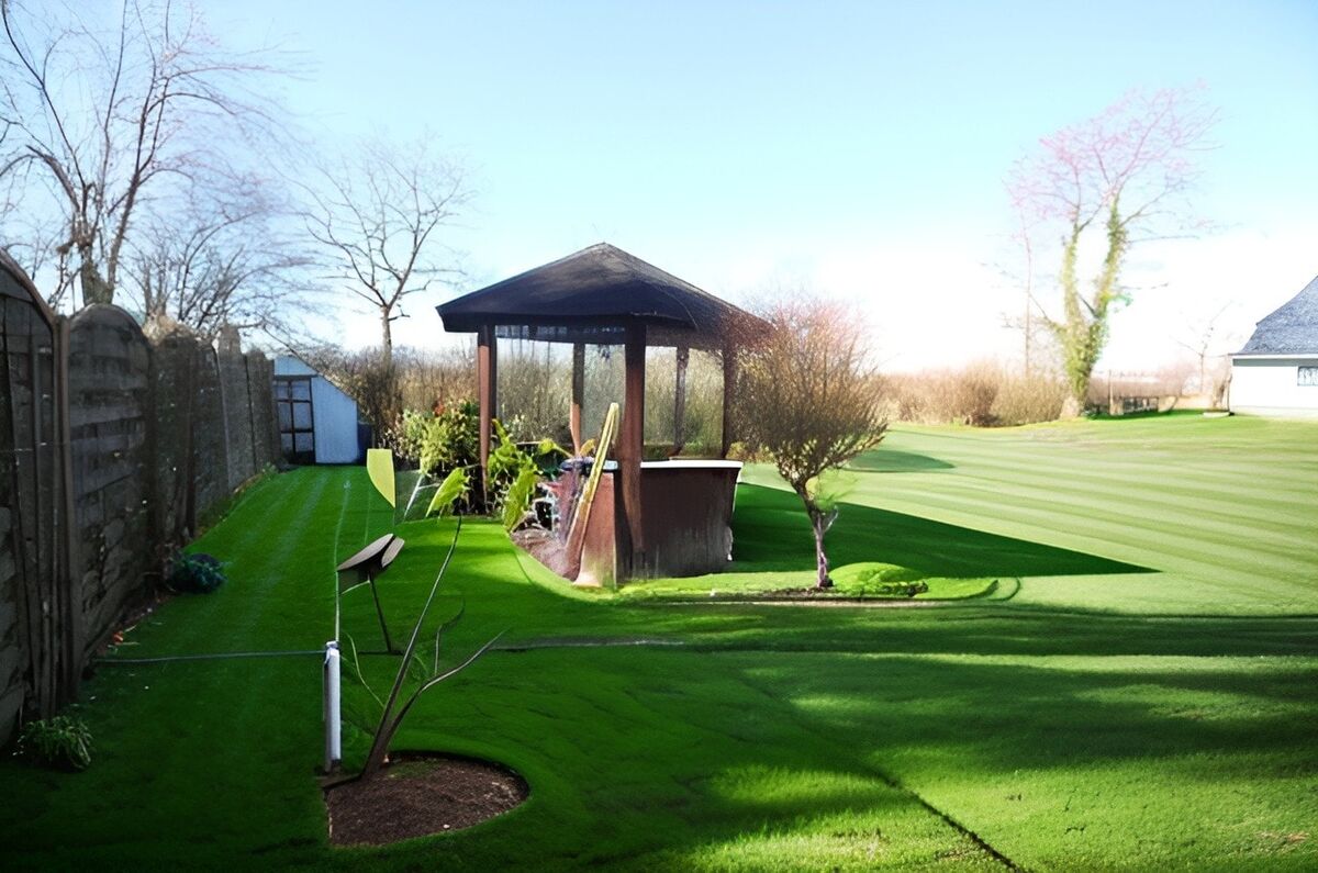 von den angrenzenden Wiesen abgeschirmt. Eine große Rasenfläche bietet viel Gestaltungsmöglichkeiten und für Kinder eine Menge Platz zum Spielen.