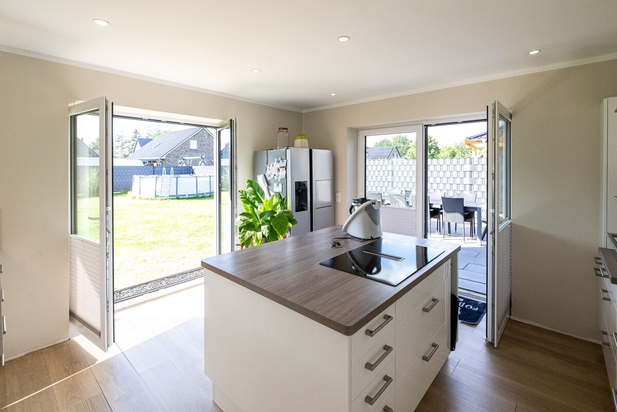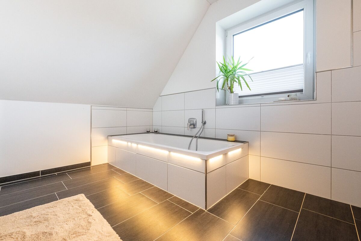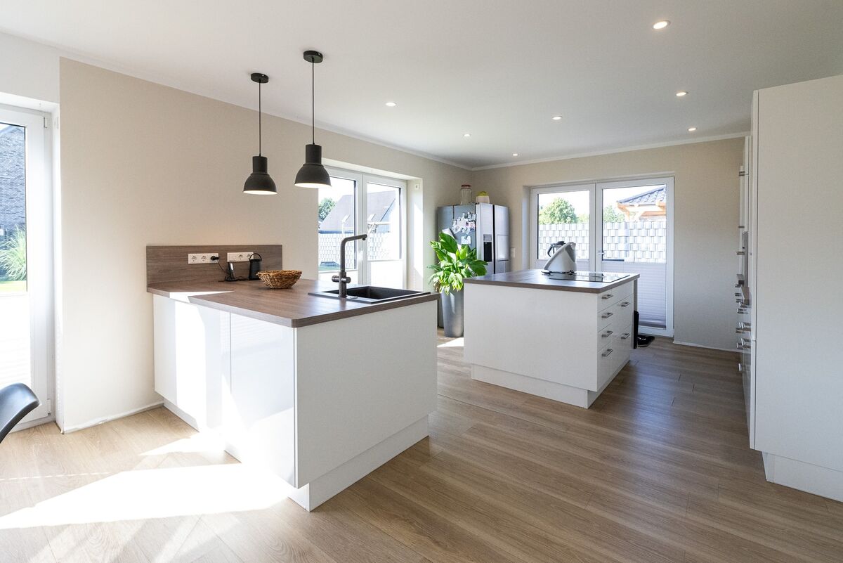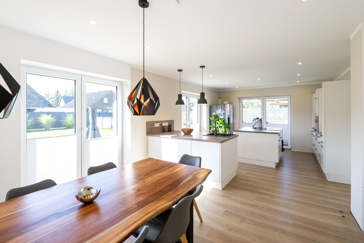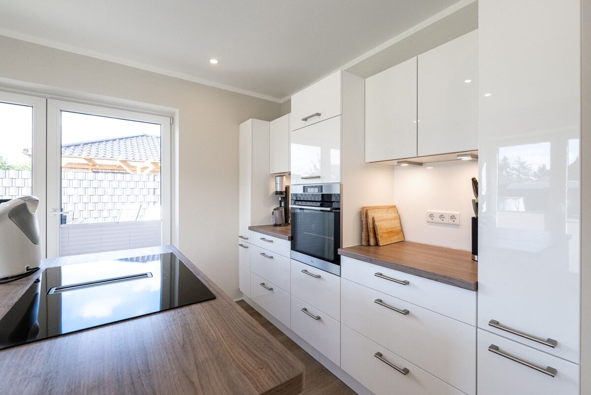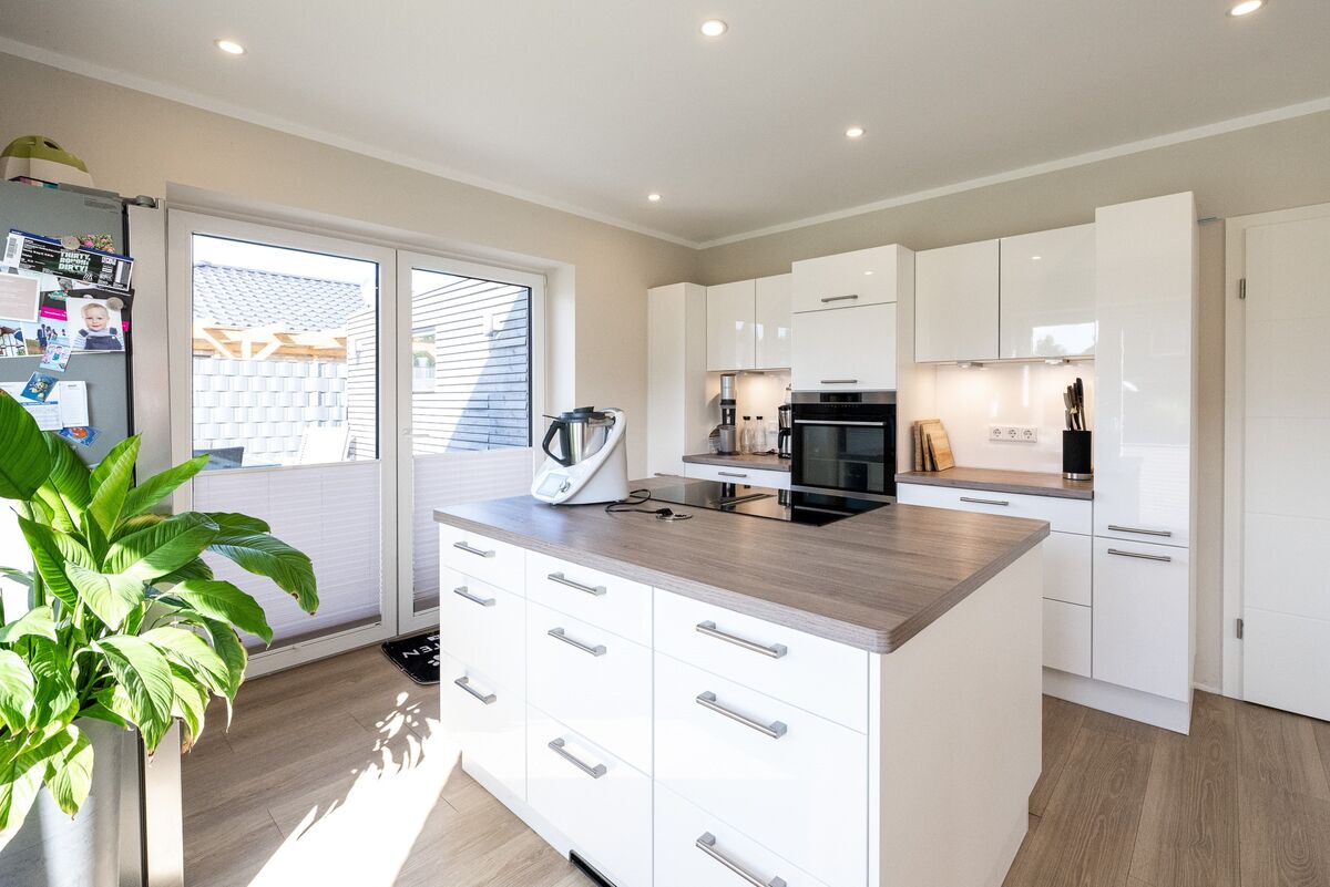 Die Ausstattung umfasst u.a. eine Einbauküche mit Inselmodul, Fußbodenheizung im gesamten Haus sowie teilweise elektrische Rollläden (in den Schlafräumen im Dachgeschoss).