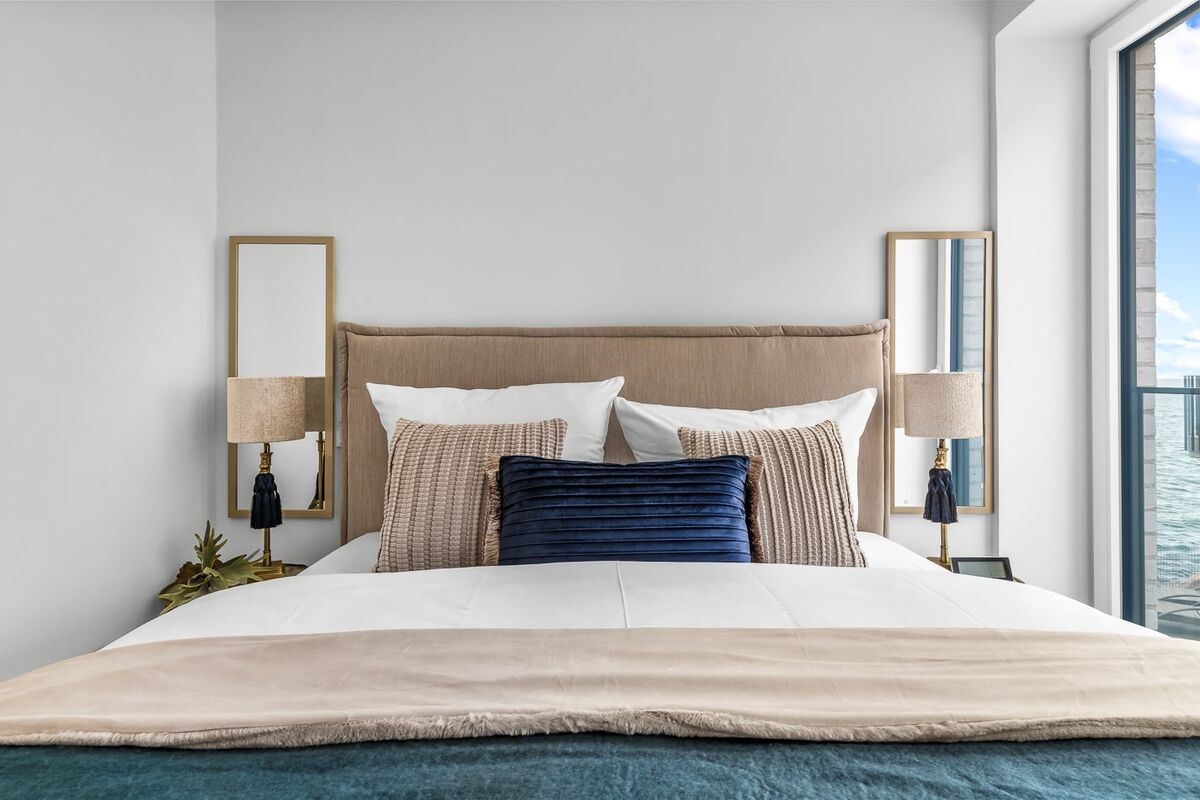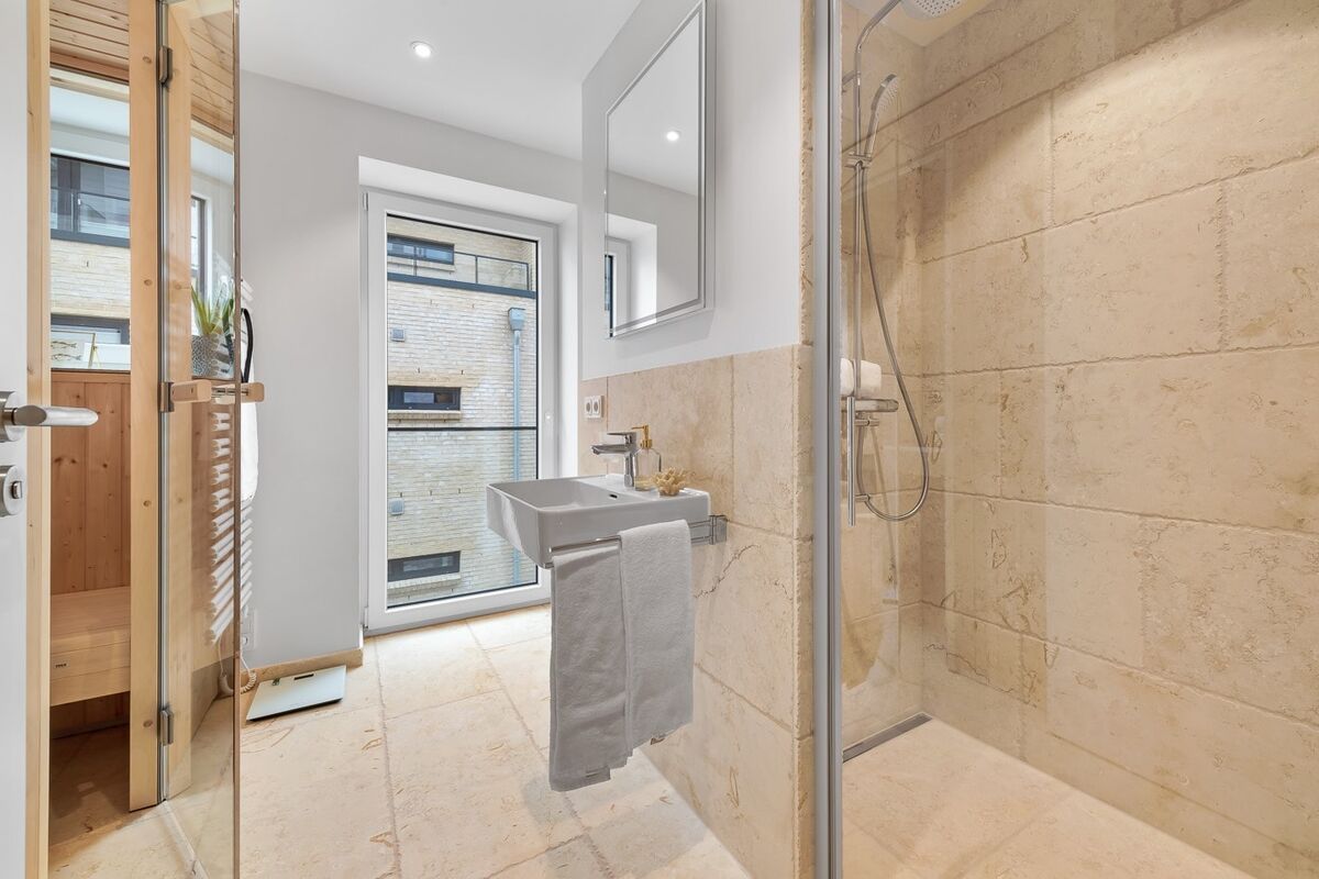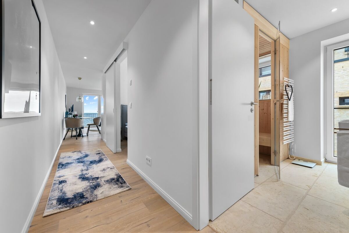 Die Wohnung 'STRANDFEDER' bietet zwei großzügige Schlafzimmer sowie ein edles Badezimmer mit Sauna für ultimative Entspannung.