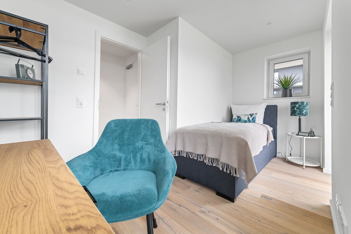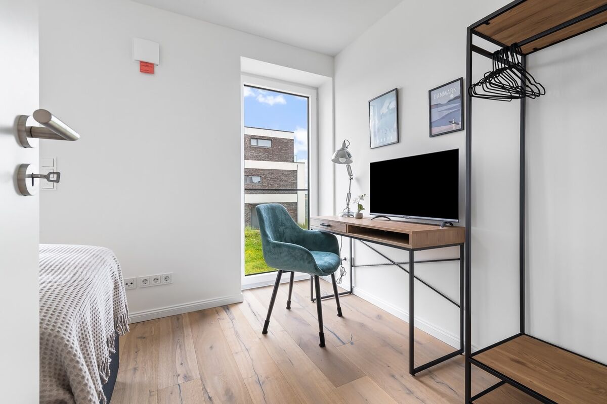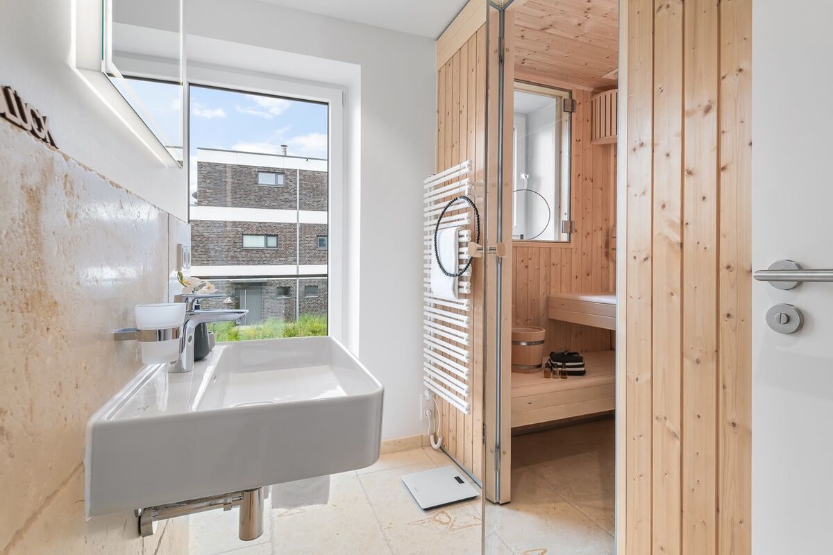 Die Wohnung 'STRANDFEDER' bietet zwei großzügige Schlafzimmer sowie ein edles Badezimmer mit Sauna für ultimative Entspannung.