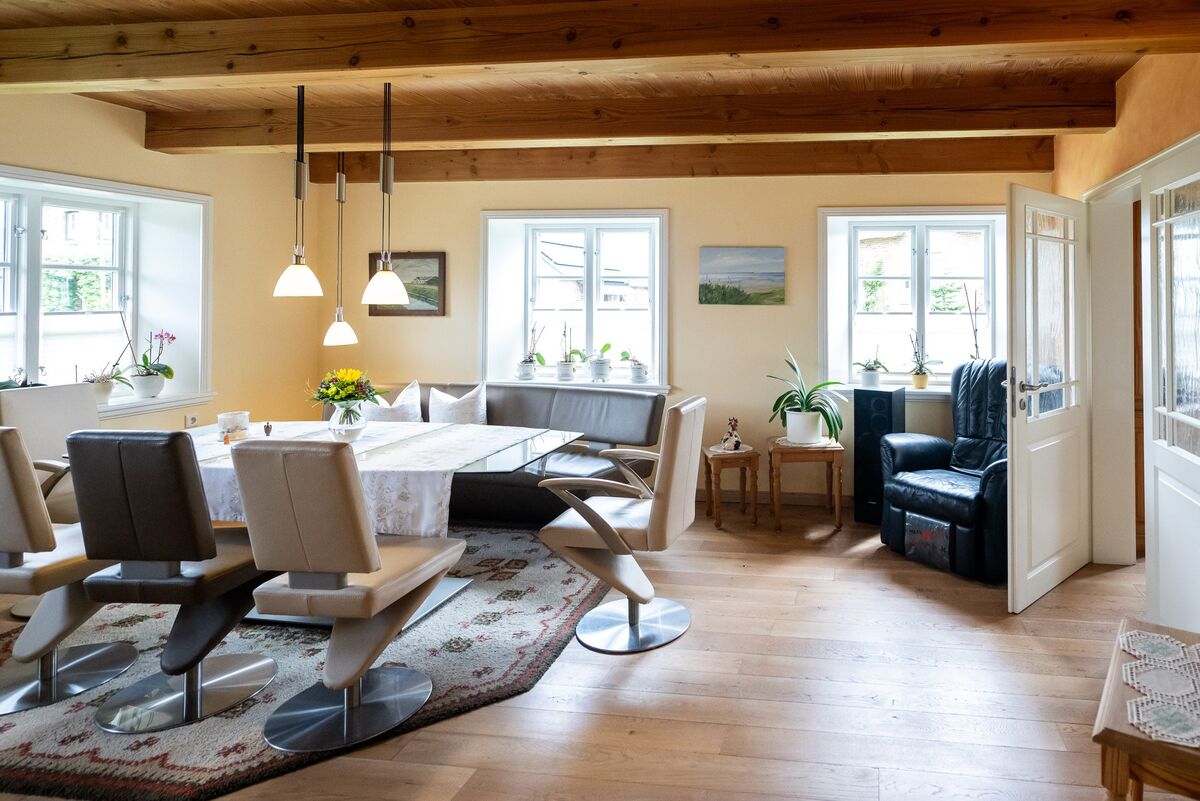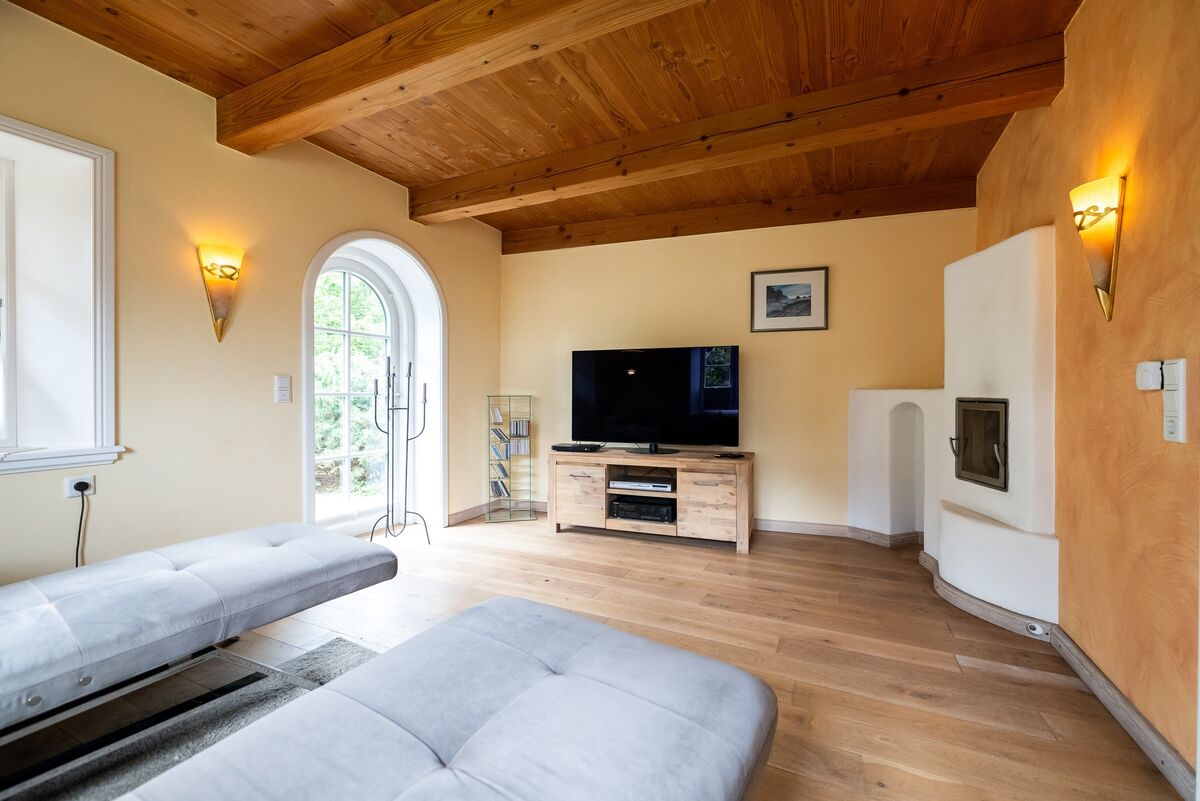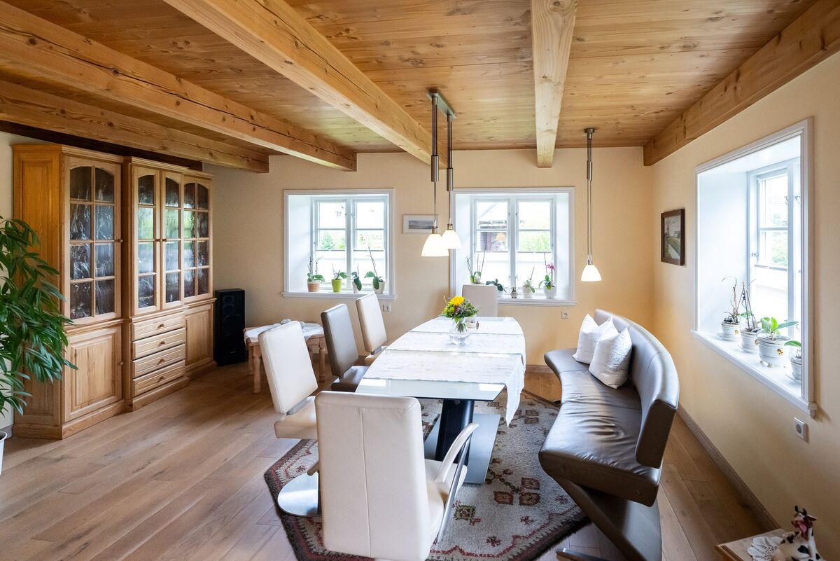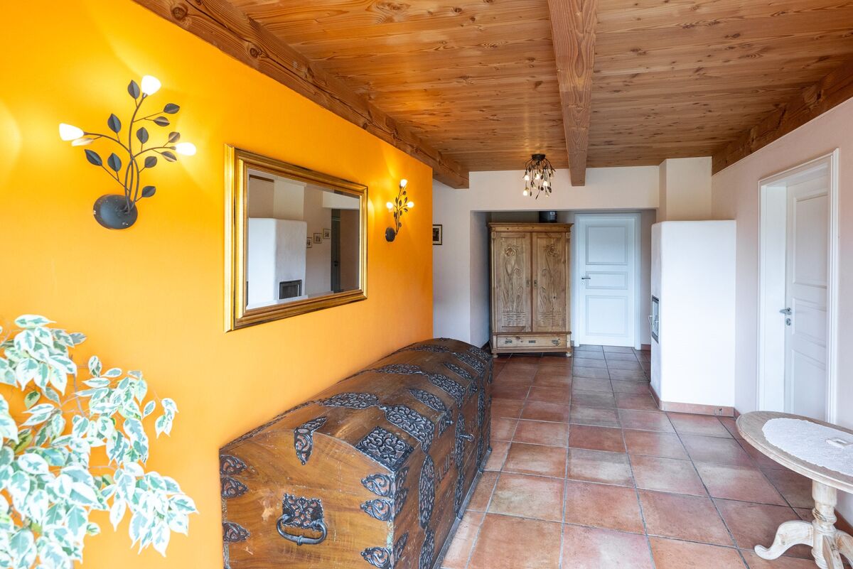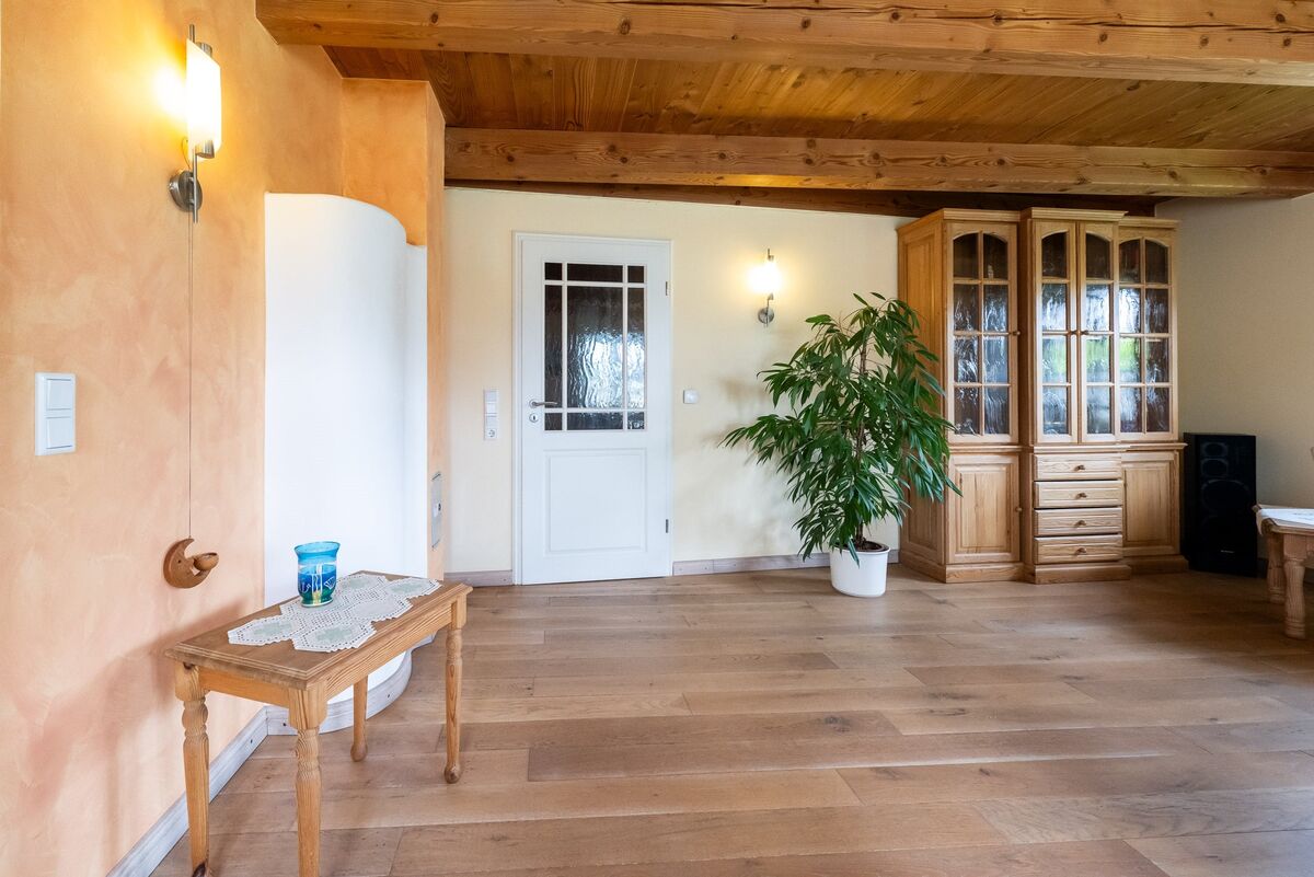 Das angenehme Wohnklima wird insbesondere durch die offene Balkenlage sowie die zwei wertvollen Grundöfen geprägt.