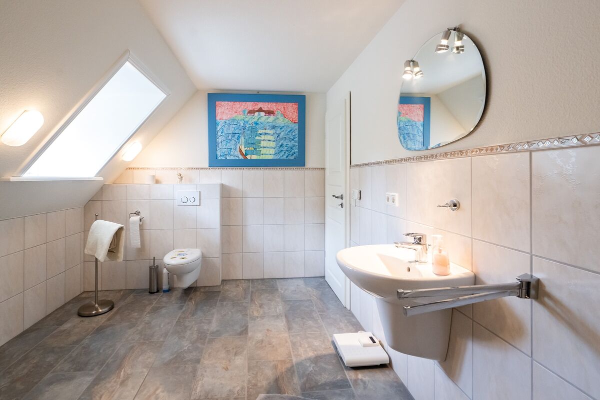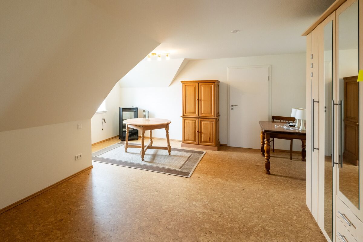 Der Grundriss des Hauses unterstützt das Wohnen zur ebenen Erde, im Dachgeschoss des Hauses ist ein Teilausbau erfolgt, der einen autarken Wohnbereich schafft (Zimmer, Bad, Flur und Abstellraum), im Weiteren ist eine großzügige, für den Ausbau bereits vorgesehene Fläche vorhanden.