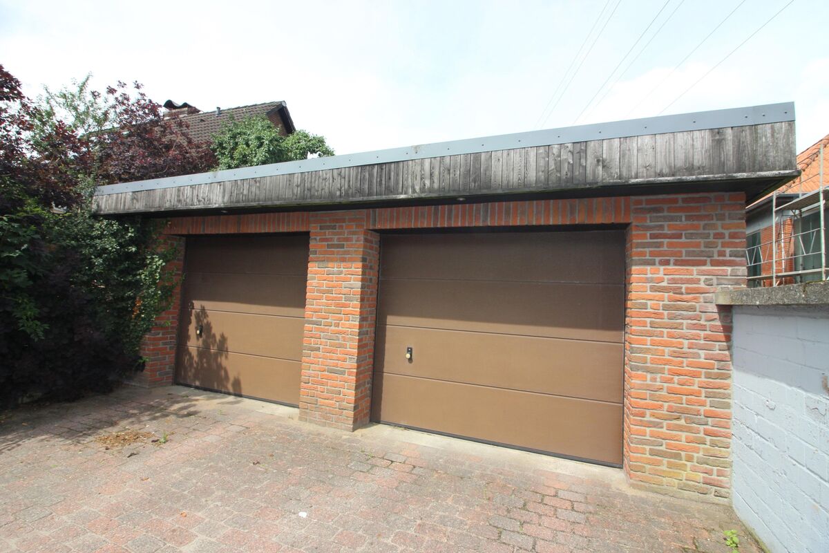 Auf dem Grundstück, das von Büschen und Bäumen umgeben ist, stehen eine großzügige Doppelgarage sowie ein Carport, das für Wohnmobile geeignet ist.