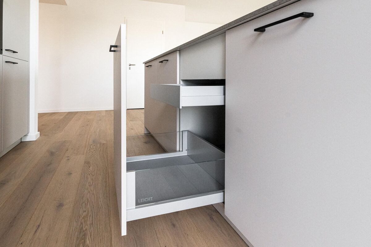 1 Wohn- und Esszimmer mit moderner EBK und direktem Zugang auf den West-Balkon (Küche) und Dachterrasse